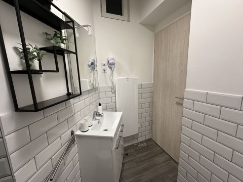 A fürdőben zuhanyfülke van, a helyiség ablakkal rendelkezik.