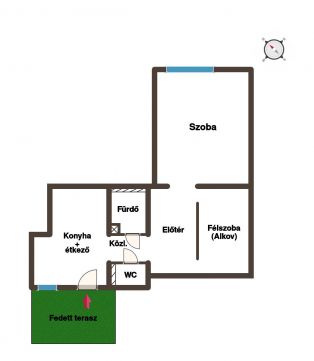 Az ingatlan egy 8 lakásos társasházban helyezkedik el. Elrendezése kiváló: áll 1,5 szobából, egy étkezős konyhából, közlekedőből, külön fürdőből és WC-ből, előtérből, valamint egy fedett teraszból. Továbbá az ingatlanhoz tartozik egy 4 nm-es kerti tároló is. A félszoba a valóságban hálófülke, ablakkal nem rendelkezik. A szellőztetés a fürdőben és WC-ben ventilátoros elszívóval, a konyhában ablaknyitással lehetséges. A lakásban a melegvíz-ellátást gázbojler, a fűtést gázkonvektor biztosítja, továbbá egy hűtő-fűtő klíma is rendelkezésre áll.