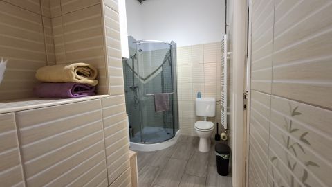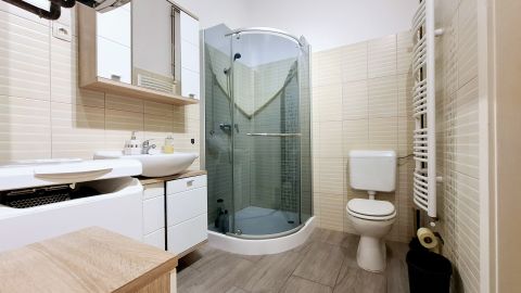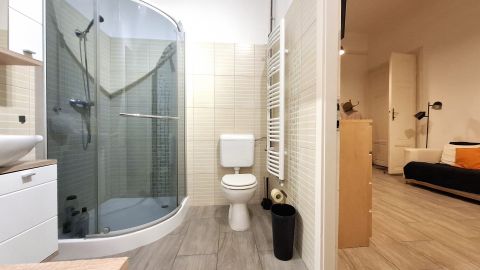 A fürdőszoba és a WC egy helyiségben került kialakításra, modern, praktikus elrendezéssel, zuhanyzóval. A fürdőszobába a nappaliból és a hálószobából is nyílik ajtó.