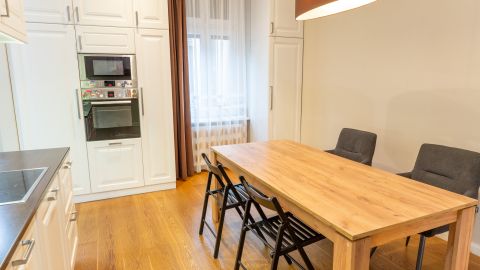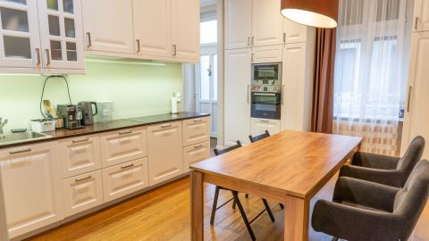 A lakás ablakai csendes utcára néznek, így a belvárosi elhelyezkedés ellenére igazán nyugodt, élhető környezetet nyújtanak.