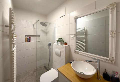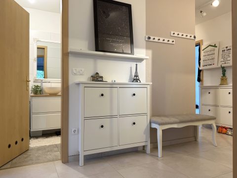 A belső elrendezés praktikus és családbarát: a lakás közepén található a kádas fürdőszoba és külön WC, emellett az egyik hálószobából egy saját, zuhanyzós fürdőszoba is nyílik. A jelenlegi tulajdonosok a szülői hálót és a gyerekszobát egy belső ajtóval összekötötték, így könnyebbé vált a közlekedés a két szoba között.