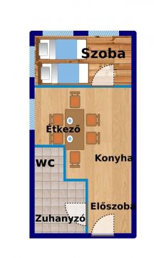 Kialakítása: amerikai nappali konyha, szoba, fürdő+wc. Az ingatlan 2019-ben épült, 2 szintes 8 lakásos társasház.