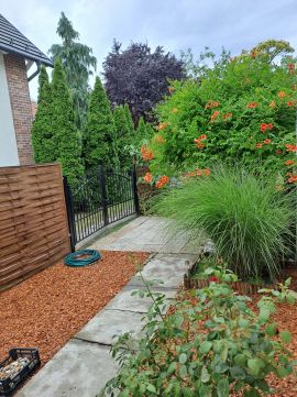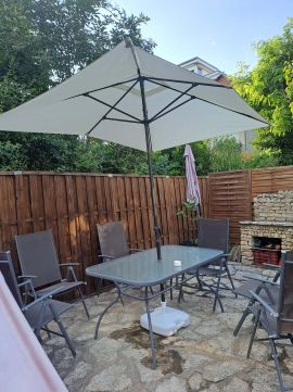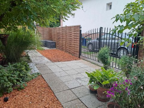 A teljesen elkülönített, saját használatú, 193 m²-es kert ideális teret biztosít pihenéshez, családi és baráti összejövetelekhez. A kertben téglából épített sütögetőbográcsozó rész, kerti tároló, valamint egy kb. 10 m²-es fedett terasz is kialakításra került.