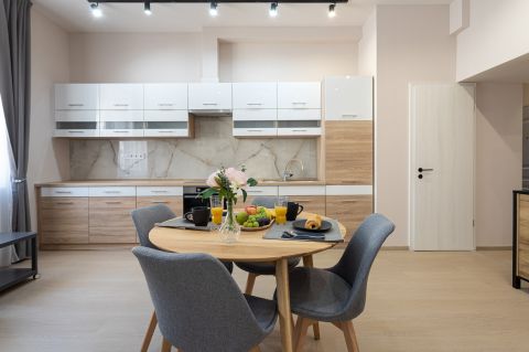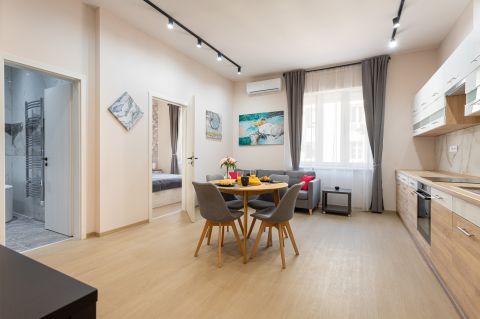 Az ingatlan teljesen berendezett, hűtő-fűtő klímával (H tarifával), konyhája gépesített (főzőlap, sütő, mosogatógép, hűtőszekrény, páraelszívó).