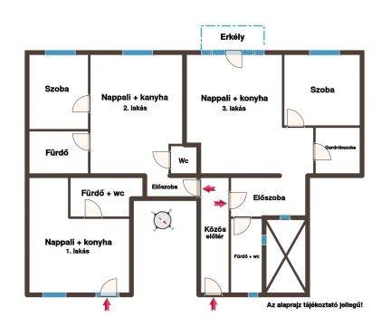 Egy nagy méretű lakásból 3 db lakást alakítottak ki, használati megosztási szerződéssel. (21,54 m2, 61,25 m2, 41 m2), az ingatlan Otthon Start hitelre NEM alkalmas! A két nagyobb lakás egy közös előtérből közelíthető meg, a legkisebb külön bejáratú.