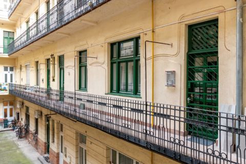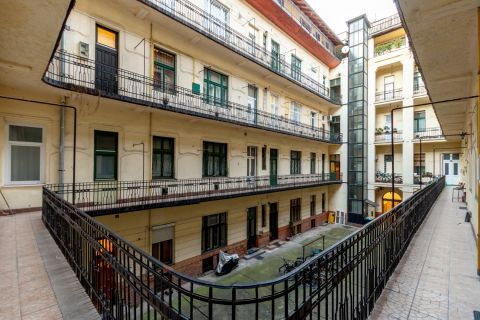 A rendezett, kiváló lakóközösségű, liftes polgári társasház első emeletén elhelyezkedő ingatlan jogilag egy helyrajzi számon szerepel (56 m² hivatalos alapterülettel), azonban a valóságban két teljesen szeparált, külön bejárattal és önálló mérőórákkal (víz, villany) rendelkező stúdiólakássá lett alakítva. A csendes, udvari nézetű lakásokban kialakított állógalériáknak köszönhetően a teljes hasznos lakótér 92 m².