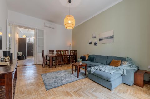 Ez a környék Budapest éjszakai és kulturális életének központja, mégis a lakás csendes, otthonos hangulatot áraszt.