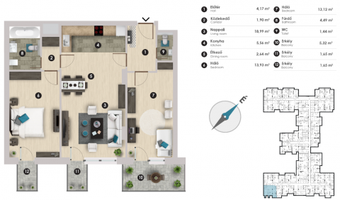 A napfényes lakás mindegyik szobájához csatlakozik egy-egy erkély.