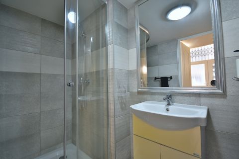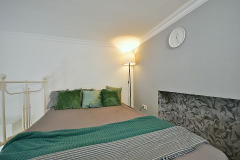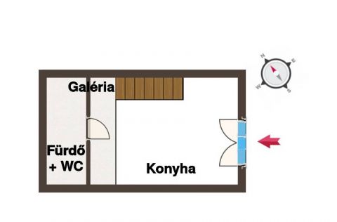 A belépés után egy konyharész fogad, innen nyílik a zuhanyzós fürdőszoba WC-vel. A 3,7 méteres belmagasság lehetővé tette egy kb. 6 m²-es galéria kialakítását, amely kényelmes hálórészként szolgál. A lakás bútorozott és felszerelt: a konyhában konyhaszekrény, hűtő, étkezőasztal és székek, a fürdőben mosógép, a galérián pedig franciaágy található.