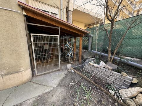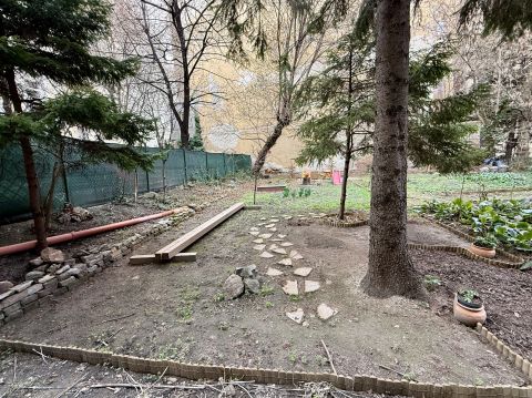 Két erkély: utcára és udvarra néző, a gondozott kertben biciklitárolóval.