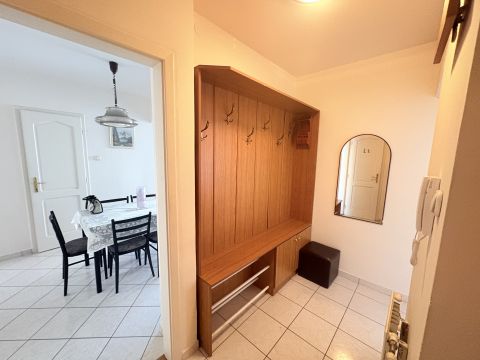 A lakás központja a tágas nappali, amely ideális a mindennapi pihenéshez és a vendégek fogadásához. A konyhához kapcsolódó spájz praktikus tárolási lehetőséget biztosít, ami nagy előny a mindennapokban.
