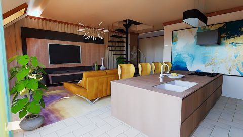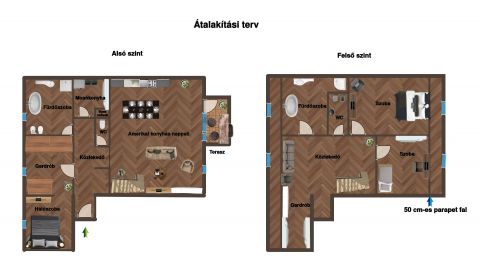 Az átalakítási tervek szerinti elgondolás: Az alsó szinten egy nagyméretű, amerikai konyhás nappali, vendégszoba, gardrób, tágas, természetes fénnyel ellátott fürdőszoba, mosókonyha és külön mellékhelyiség kerül kialakításra. A nappalihoz kapcsolódó, 4 m²-es teraszról zavartalan kilátás nyílik a park zöldjére és a tóra mely olyan adottság, amely ritka és kiemelten értékes.