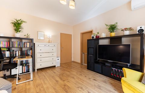 A megfelelő hőmérsékletről a nappaliban és a szülői hálóban felszerelt hűtő-fűtő klímaberendezések gondoskodnak. Ezekből a helyiségekből érhető el az erkély is, mely tökéletes helyszíne lehet a családi rendezvényeknek.