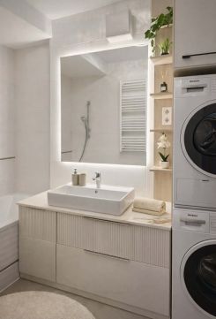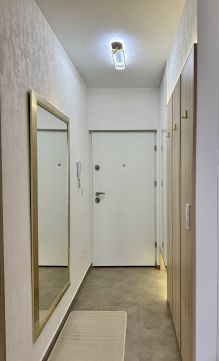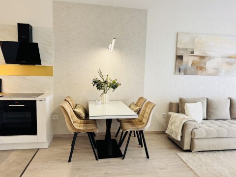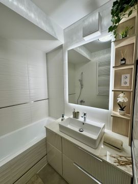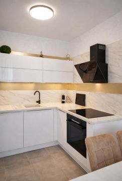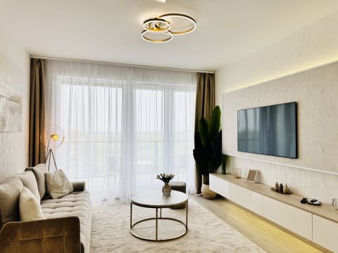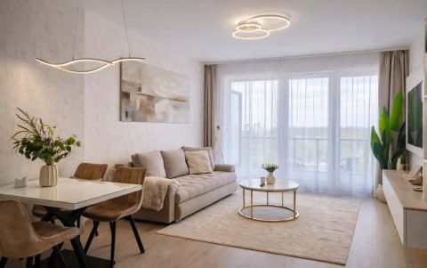 The apartment is fully equipped, including a coffee machine, microwave, induction hob, as well as a complete set of cookware, cutlery, and tableware ready to move in without compromise.