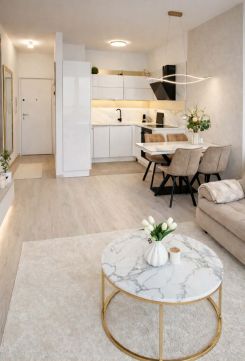 The apartment offers a clean, modern design with a well-thought-out layout. The living room and kitchen share an open-plan space filled with natural light, complemented by premium furniture and elegant finishes. The bedroom provides a शांत, comfortable environment ideal for relaxation.