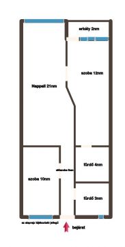 Elrendezés: amerikai konyhás nappali + 2 külön nyíló hálószoba