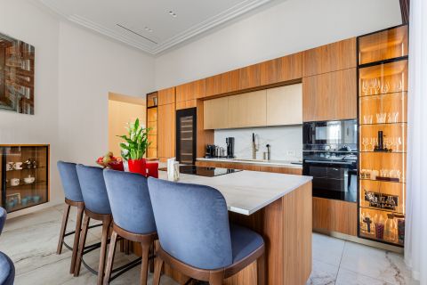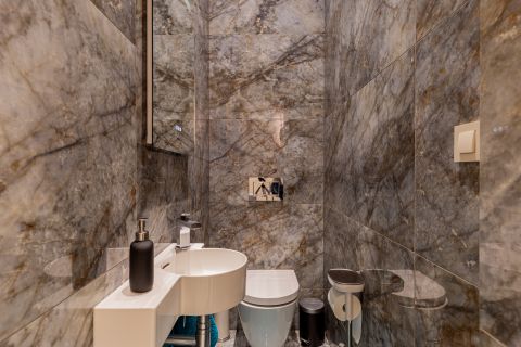 A konyha egyedileg gyártott, magas minőségű anyagok felhasználásával készült, míg a fürdőszobák formabontó kialakításukkal és exkluzív anyaghasználatukkal emelik az ingatlan színvonalát.