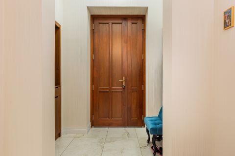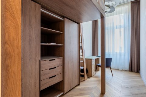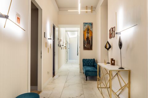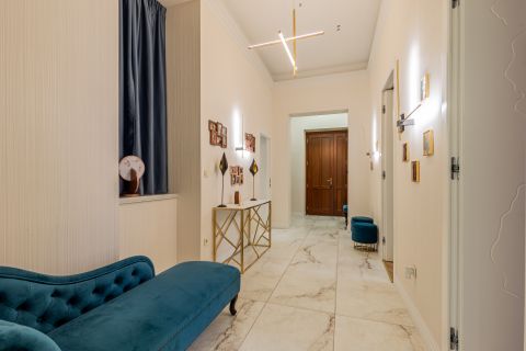 A lakás berendezése a gondos tervezés és a magas szintű kivitelezés eredménye. A mennyezetig beépített, szinte észrevétlen tárolórendszerek, az egyedi design bútorok és lámpák, valamint a kifinomult színvilág és prémium textilek harmonikus, időtálló eleganciát teremtenek.