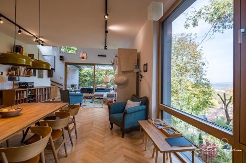 A ház félig a hegyoldalba süllyed így télen és nyáron is kellemes alap hőmérsékletet biztosít, a hatalmas üvegfelületek pedig világossá teszik a lakás minden helységét. Megegyezés szerint rövid időn belül költözhető.