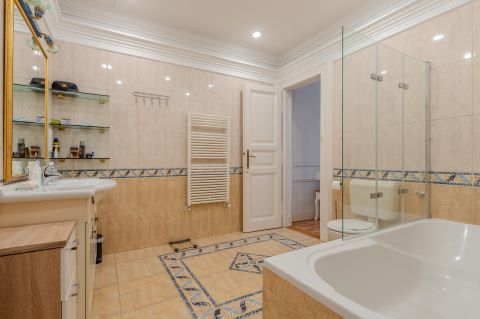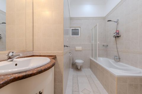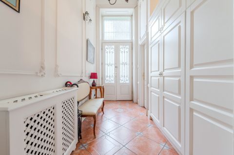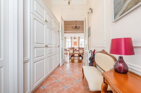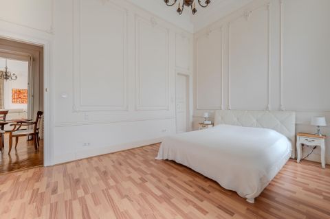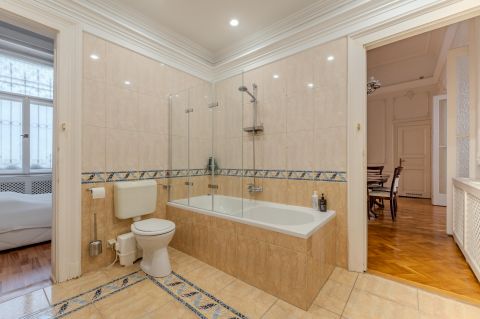 A második emeleten lévő lakás kiváló elosztású: tágas előtér, nagy étkező harmonikaajtóval a nappaliba, két hálószoba, két fürdőszoba és 3 WC biztosítja a kényelmet.A hatalmas belmagasság, a klasszikus stukkódíszítés, az eredeti történelmi fa nyílászárók ,spaletták ,és a világos, utcai ablakok egyedülálló nagypolgári hangulatot teremtenek.A fűtés gáz cirkó. Riasztó,és légkondicionáló van.