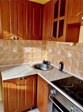 Fa konyhabútor, elektromos főzőlappal, bárpulttal.