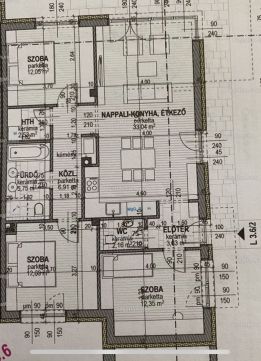 Elosztás: amerikai konyhás nappali + 3 teljes értékű hálószoba