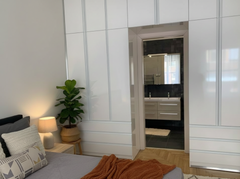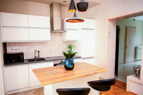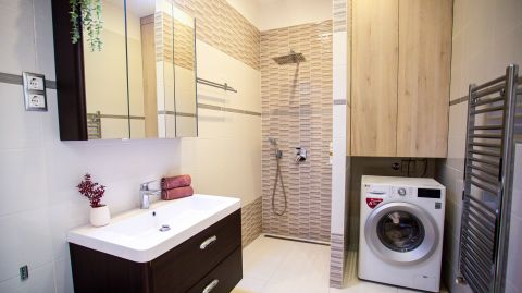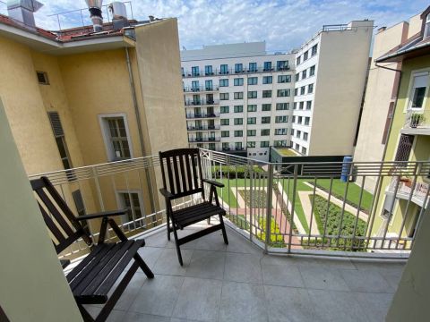 Az ingatlan egy 16 lakásos, liftes, hangulatos zöld belsőkerttel rendelkező ház 3. emeletén helyezkedik el. Rendkívül jó beosztásnak köszönhetően, kapott helyet benne egy több mint 30 nm-es amerikai-konyhás nappali, szülői háló külön fürdőszobával, egy beépített gardróbbal rendelkező gyermek/vendég/dolgozó szoba fürdőszobával és egy tágas előszoba kis tárolóval. Mosogatógép, mosógép, szárítógép és riasztó is található a lakásban. Fűtése gáz cirkó rendszerű, radiátoros hőleadókkal. Minden szobában légkondícionáló található.