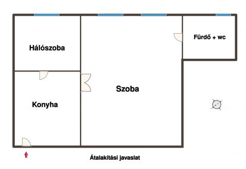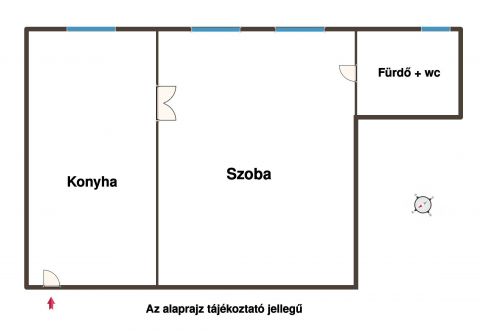 Elrendezés: Tágas szoba, külön konyha, valamint fürdőszoba. Igény esetén nappali + hálószobás lakássá alakítható.