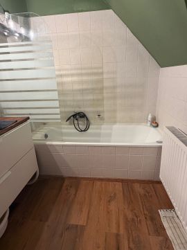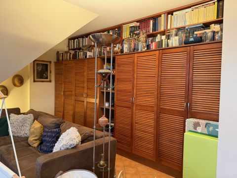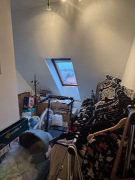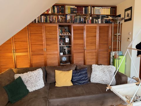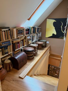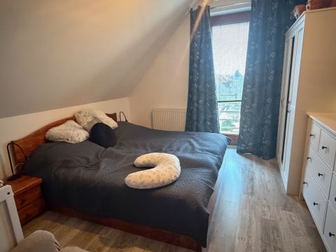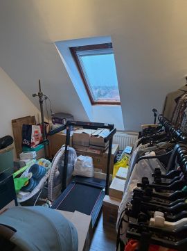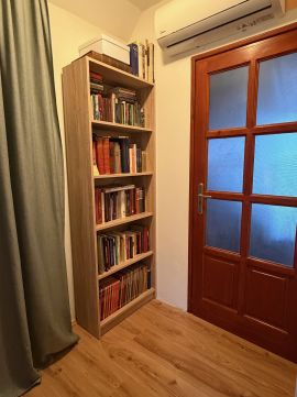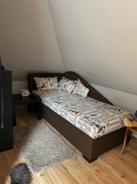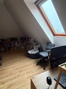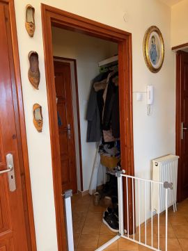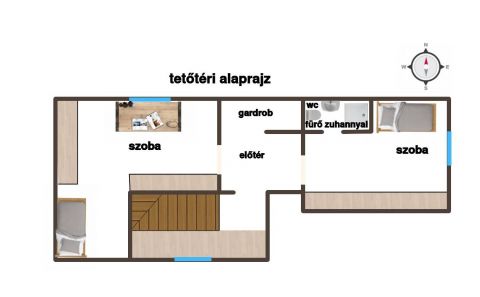 Belső előtérből két külön nyíló, korrekt méretű tetőtéri szoba, zuhanyzós fürdő WC-vel, kis gardróbhelyiség, a lépcsőfeljáró mellett nagyobb tároló/puffer terület, ami ritka és nagyon praktikus tetőtéri lakásoknál