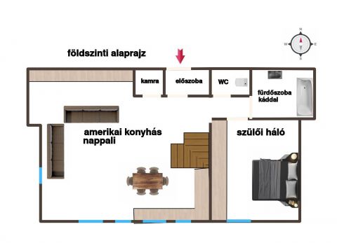 Előtér, 36 nm-es, kimagaslóan tágas amerikai konyhás nappali, 14 nm-es kényelmes méretű szülői hálószoba, kádas fürdőszoba, WC külön helyiségben, kamra / háztartási tároló