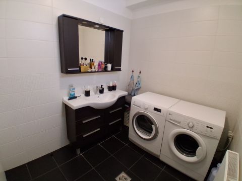 A vételár részét képezi továbbá az épületben található 17,13 m2-es, Hörmann garázskapuval ellátott garázs, mely a lépcsőház bejáratától csupán pár méterre található, így a nagybevásárlások alkalmával is kényelmes dolgunk van. A garázs járólappal ellátott, oldalfala festett, áramellátása a lakás villanyórájára van kötve.