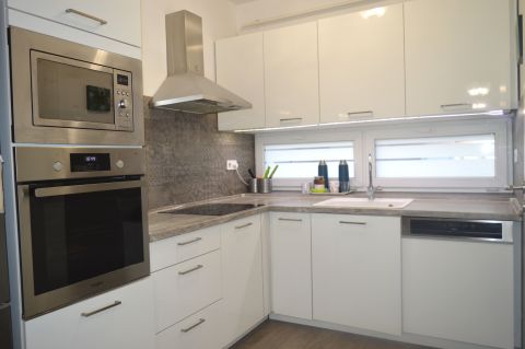 A lakás vételárának részét képezi a gépekkel felszerelt konyhabútor, a klímaberendezés, a wc és a fürdőszoba bútorai, a folyosón a gázkazánt rejtő beépített szekrény, valamint a nagyobb szobában lévő polcos-vállfás osztású beépített ruhásszekrény is. A magasfényű, króm fogantyús fehér konyhabútor ajtó- és fióklassítóval van felszerelve. A konyhabútor részét képezi még a beépített inox mikrohullámú sütő, mely alatt inox sütő található, valamint része az indukciós főzőlap, az inox páraelszívó és a beépített mosogatógép.