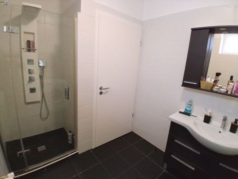 A tágas, épített zuhanyzó Ravak márkájú üvegajtóval zárható.