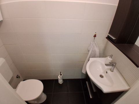 A konyha és a folyosó szürke színű járólapot kapott, a konyhában ehhez illő fali csempe került felrakásra. A különálló wc és fürdőszoba azonos stílusban került kialakításra, amelyben sötét színű járólap és fehér, valamint fehér-fekete aprómintás falicsempe került. E két helyiség bútorai azonos bútorcsalád tagjai.