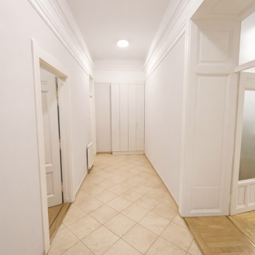 A lakás jelenlegi kialakítása három nagyméretű szobából áll, amelyek 23 m², 24,5 m² és 40 m² alapterületűek. Az alaprajzi adottságok lehetővé teszik akár egy negyedik szoba kialakítását is, így az ingatlan rugalmasan alakítható a jövőbeni igények szerint. A három métert meghaladó belmagasság tágas, elegáns térérzetet biztosít, a délnyugati tájolásnak köszönhetően pedig a helyiségek világosak és napfényesek. A lakás panorámás kilátással rendelkezik, ami tovább növeli az értékét és az exkluzív érzetet.