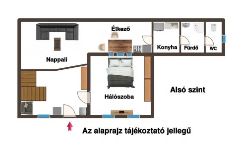 A földszinten nappali, gépesített konyha (hűtő, mosógép, mosogatógép, mikró, kisebb konyhai gépek), hálószoba, fürdőszoba és külön WC kapott helyet. A galéria akár hálóként vagy dolgozószobaként is használható. A fűtés kondenzációs gázcirkóval történik, emellett a hálószobában egy hűtő-fűtő klíma is van. Minden fogyasztás mérőórával mérhető. Közös költség: 15.300 Ft/hó.