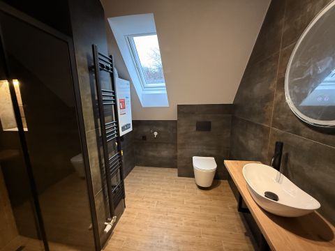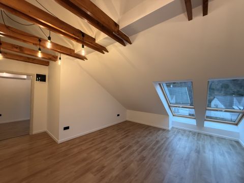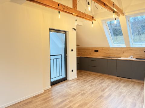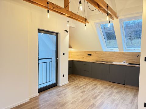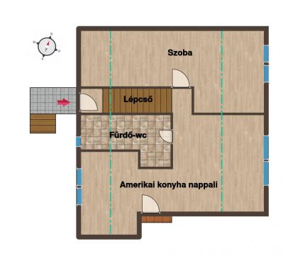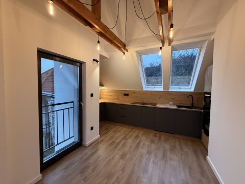 Az ingatlan elosztása amerikai konyha nappali+ 1 szoba beépített gardróbbal, fürdő-wc, dupla tetőerkély és 100m2 kizárólagos KERTKAPCSOLAT.