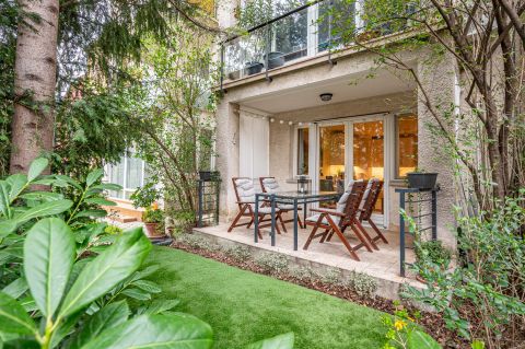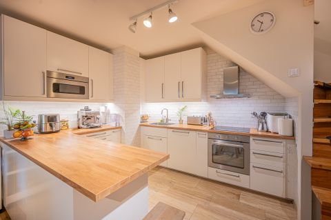 Az alsó szinten egy modern, nagy, gépesített konyha és étkező kapott helyet, amely közvetlen kapcsolatot biztosít a teraszhoz és a saját, gondozott kertrészhez, amely egy átmenő forgalomtól mentes, csendes zsákutcára néz. A konyha és a terasz is teljeskörű felújításon esett át: beépített mikróval, pirolitikus sütővel és indukciós főzőlappal felszerelt. A terasz tökéletes helyszín a közös étkezésekhez, baráti vagy családi összejövetelekhez.