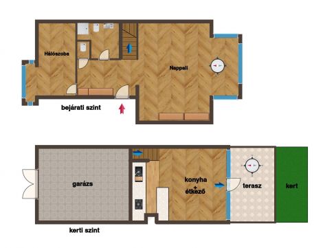 Az ingatlan déli tájolású, tágas, franciaerkélyes nappalival rendelkezik, amely a felújítás során új tölgyfapadlót és szúnyoghálóval felszerelt nyílászárót kapott, ezzel biztosítva a világos, barátságos életteret. Az emeleten található még egy hálószoba, egy teljesen megújult fürdőszoba WC-vel, valamint egy plusz különálló WC is.