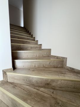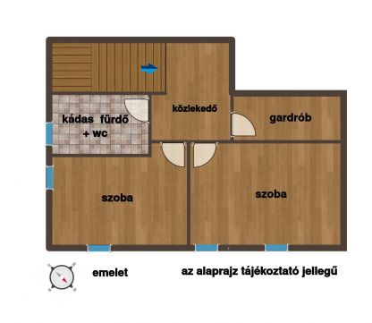 A nappali végéből vezet fel a lépcső a felső szintre, ahol egy kényelmes közlekedőből nyílik minden helyiség: