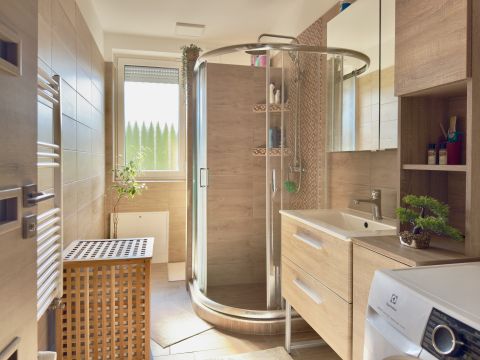 zuhanyzós fürdőszoba WC-vel és ablakkal