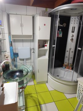 A lakás jó állapotú, tágas fürdőszobával rendelkezik, amely zuhanyzóval felszerelt. A melegvizet villanybojler biztosítja. A fűtésről konvektor gondoskodik, a nyári hőséget pedig klíma teszi elviselhetővé.