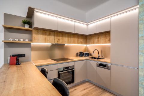 A lakás modern stílusban került felújításra, amely során egy konyha, egy szoba és egy fürdőszoba került kialakításra, maximálisan kihasználva a rendelkezésre álló teret. Az ingatlanból a 5 szintes épület legfelső emeletén lévő, a csendes udvarra néző kilátás nyílik, biztosítva ezzel a nyugodt otthoni környezetet.