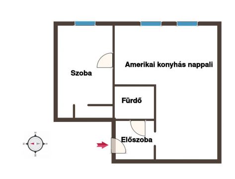 A lakás áll ~ amerikai konyhás nappali, szoba, zuhanyzós fürdőszoba, előszoba helyiségekből.
