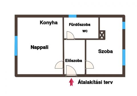 Az ingatlan tulajdoni lap szerint földszinten helyezkedik el, de valóságban magasföldszinten. Állapotát tekintve lakható, de műszaki felújításra és modernizálásra szorul. Az ingatlan jelenlegi elrendezése magába foglal egy szobát, egy tágas, étkezős konyhát és egy kádas fürdőszobát mellékhelyiséggel. Fontos kiemelni, hogy a lakás kis ráfordítással, a konyha áthelyezésével egyszerűen kétszobássá alakítható. A lakás melegéről gázkonvektor gondoskodik, míg a melegvízről villanybojler.