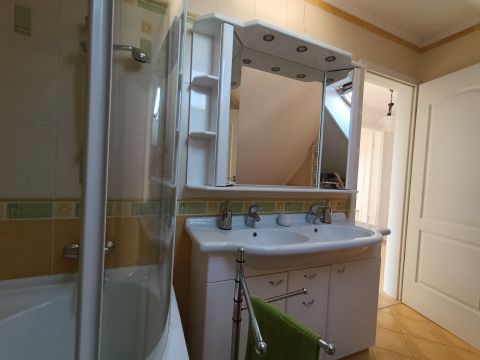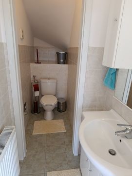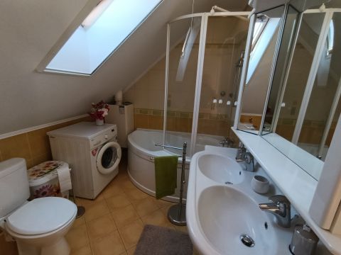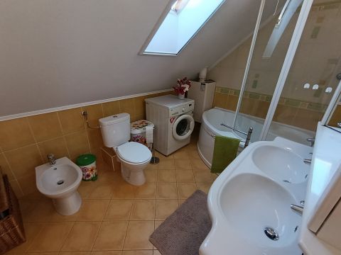 Az emeletre felérve a nagy fürdő - sarokkád, wc, bidet, 2 személyes mosdó nagy tükörrel. Itt található a gázcirkó is, ami a fűtést és melegvizet szolgáltatja. Törölközős szárító radiátor is felszerelésre került. Az egyik tetőtéri szobából francia erkély nyílik, dupla teraszajtóval.