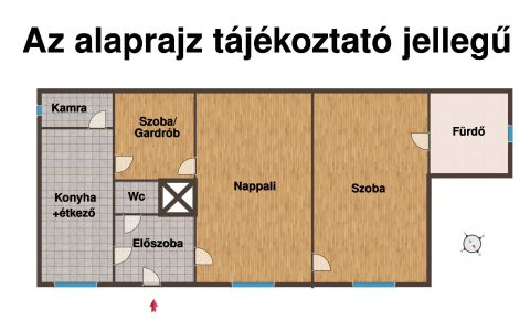 Elrendezése: előszoba, konyhaétkező, kamra, hálószoba, nappali, félszoba, fürdő, külön WC