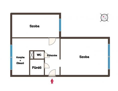 Az ingatlanba egy több ponton záródó biztonsági ajtón keresztül juthatunk be, az elosztása pedig kiváló, áll két szobából, nagy előszobából, ahol beépített szekrények kaptak helyet, egy étkezős konyhából, ami házak közti zöld területre néz, külön fürdőből és WC-ből, továbbá az ingatlanhoz tartozik egy saját tároló is.
