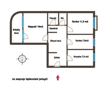 ablakos konyhás + étkezős, gardróbos, kádas fürdőszobás, külön mellékhelyiséges