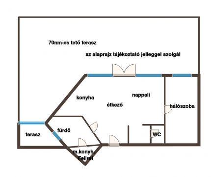 Alapterület: 50 nm lakótér + 70 nm saját tetőterasz